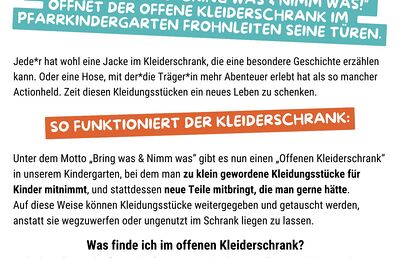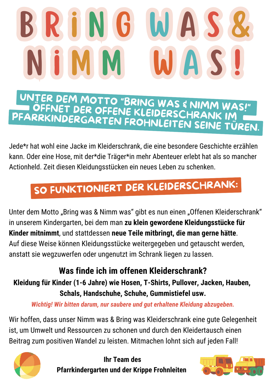 Der „Bring Was & Nimm Was – Kasten“ funktioniert ganz einfach: Wer gut erhaltene Kleidung übrig hat, legt sie hinein – wer etwas braucht, darf sich bedienen. So finden gut erhaltene Kleidungsstücke ein neues Zuhause, anstatt im Müll zu landen oder ungenutzt im Schrank zu verstauben.