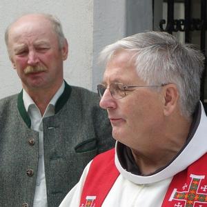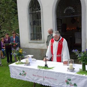 In Vertretung des Fußwallfahrers P. Simon zelebrierte Franziskaner-Guardian P. Josef Höller aus Graz in launiger Weise die Eucharistie, zu der rund 80 Gläubige bei herrlichem Wetter zu Fuß, mit den Fahrrädern oder per Auto gekommen sind.