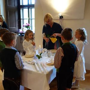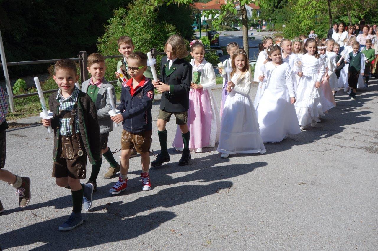 Die heurige Erstkommunionfeier stand unter dem Motto "Ich bin das Brot des Lebens". 50 Kinder (26 Mädchen und 24 Buben) haben sich monatelang mit ihren 18 Tischmüttern auf diese Erstkommunion vorbereitet. Mit einer gemeinsamen Prozession wurden sie von der Kapelle des Musikvereins Frohnleiten bei herrlichem Frühlingswetter von der Volksschule zur Pfarrkirche geleitet, um dort in der Eucharistiefeier nach der Tauferneuerung die erste Kommunion von Pater Simon zu empfangen. Die heilige Messe wurde vom Kinderchor unter der Leitung von Christine Klöckl wunderschön musikalisch umrahmt. Nach dem Lied "Großer Gott wir loben dich" lud die Katholische Frauenbewegung die Kinder und die Tischmütter zum Brotbrechen in den Pfarrsaal und alle Mitfeiernden zu einer Agape in den schönen Klostergarten ein.