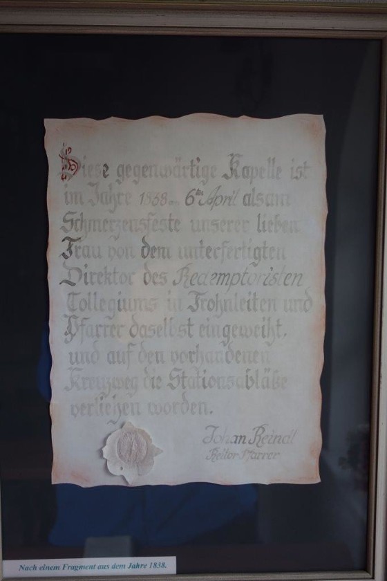 Die Theresien-Kapelle beim „Reinprecht“ in Schrems 44 wurde laut einem gefundenen Fragment bereits am 6. April 1838, dem Schmerzensfeste unserer lieben Frau, vom Direktor der Redemptoristen des Kollegiums in Frohnleiten, Pfarrer Johann Reindl, eingeweiht. Dies besagt eine Urkunde, die in dieser wunderbaren Kapelle vorhanden ist.
