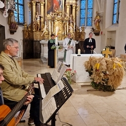 Von der schwungvollen Musik unserer Musikgruppe begeistert, sangen wirklich alle gerne mit, vom  Kirchenchor bis zu den VS-Kindern, deren besonderer Erntedankschmuck übrigens nun die Empore im Altarraum ziert.