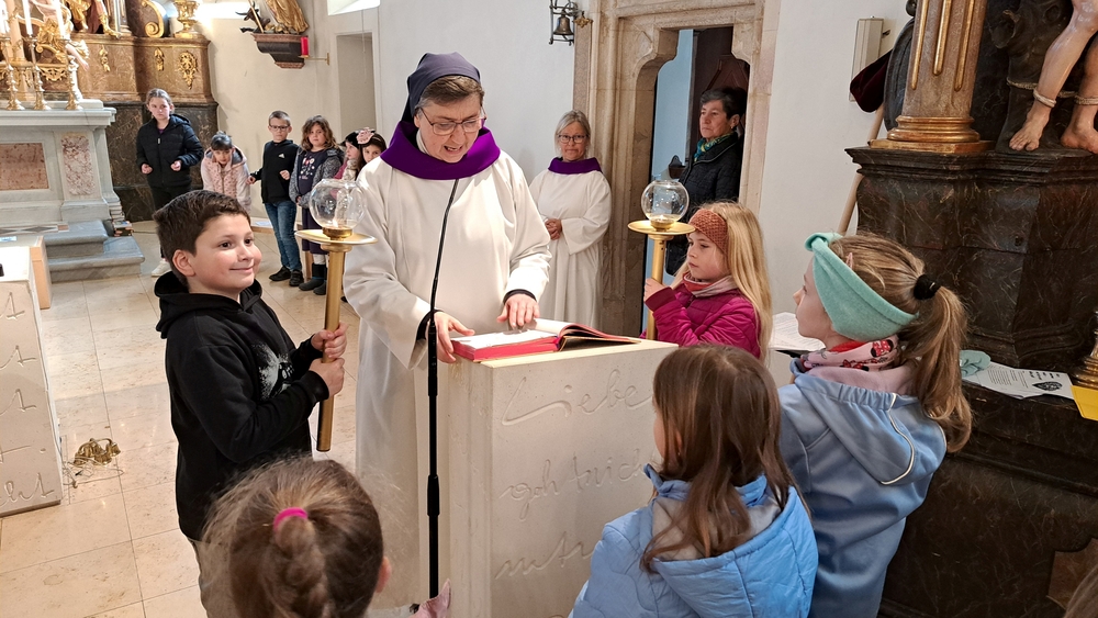 So feierten Groß und Klein mit Vikar Gerhard Hatzmann und Diakon Michi Zepf die heilige Messe zum Palmsonntag in einem schönen Miteinander. Die Kindergartenkinder sowie einige MS-Schülerinnen gestalteten die Feier mit und die MINIS versahen nicht nur ihren Dienst am Altar, sondern trugen auch die „Passion“ vor - in einer einfacheren Fassung, mit passenden Liedstrophen und Symbolen. Auch die Landjugend nahm teil und kam nach guter Tradition mit ihrem großen Palmbuschen.