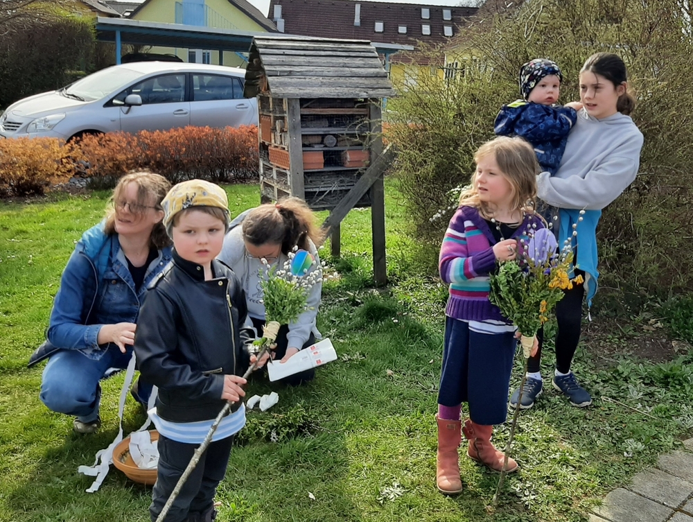Nach altem Brauch segnete Diakon Michi Zepf am Karsamstag schon frühmorgens das Feuer vor der Kirche, das einige Kinder dann als „Weihfeuer“ in die Häuser und Wohnungen brachten. Es soll die Bewohner*innen vor Unwetter schützen.