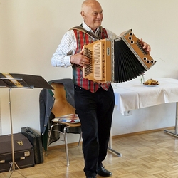 In netter Gemeinschaft genossen die Seniorinnen und Senioren dann die Würstel-Jause sowie Kuchen und Kaffee. Dazu sorgte Anton Ruprecht auf der Ziehharmonika für angenehme musikalische Untermalung.